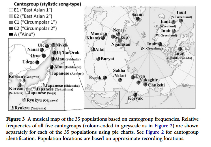 In contrast to domesticated animals, wild animals can also understand human songs, but these are not the clear high harmonics which signal protection. Arctic peoples such as the Sami are known to sing or joik specific songs to specific animals - ie the ‘bear’s song’, or the ‘elk’s song’. The concept of a ‘personal song’ also exists amongst the Inuit and the Sami, an idiosyncratic melody/rythmn which can be intensely personal and rarely if ever vocalised. More broadly however, animal imitation forms part of the well-explored circumpolar/circumboreal musical repertoire. According to ethnomusicologist William P. Malm, this region around the Arctic, encompassing the Ainu, Sami, Siberian peoples, Aleuts, Inuit and some other Native Americans, displays a roughly shared musical lexicon of: animal imitation sounds, breathing/sound games and harsh, throaty utterances, use of framed drums, an acceptance of loose sing-speak epic chants or narratives, use of timbre-rich instruments such as the jaw harp and various local zither/lute variations. Studies of how well the Ainu fit into this pattern have been fairly extensive, including a 2015 article called How ‘Circumpolar’ is Ainu Music? Musical and Genetic Perspectives on the History of the Japanese Archipelago, which attempted to fit the Ainu musical heritage with their known genetic admixtures.