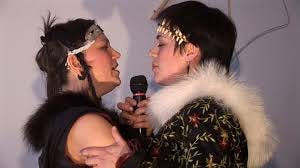 The two women, dressed in furs, grasp each other by the arms and come face to face. A stream of rhythmic punctuated sounds begin to issue forth from them, some like escaping air from a sealskin, some like harsh feline growls. They press their faces closer, their breath mingling as they almost stab one another with each exhalation, before they finally collapse into the snow, laughing hysterically. Called katajjaq in Nunavik, the Inuit practice of female competitive throat singing is an interesting counterpart to the male practice of verbal duels mentioned above. Katajjaq shares many similarities with other circumpolar throat singing and musical practices, including the intense use of environmental and animal mimicry, as well as the sharing of breath and use of another person’s mouth as a resonance chamber for notes and sounds.