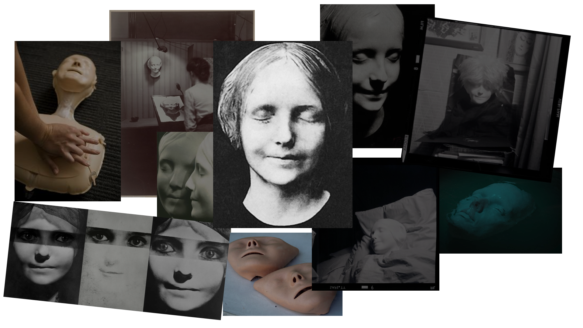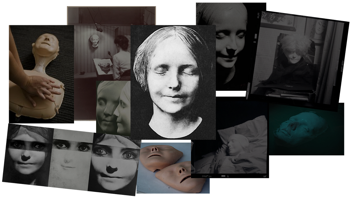 Some time in the late 1800’s a young woman was pulled out of the Seine at the Quai du Louvre. She was dead, maybe 16 years old, and she was flawless. The story goes that the coroner who examined her body was so moved by her beauty, so enraptured by her perfection, he fashioned a wax death mask from her face. A plaster one soon followed. These masks quickly sold out in Paris as many writers and artists rushed to hang her smooth likeness on the wall - Nabokov, Rilke, Man Ray. Camus compared her to the Mona Lisa for her subtle smile and serene expression. Louis-Ferdinand Céline sent her picture to a publisher that wanted a photograph of him. Eventually her perfect face became the model for novice painters, and the CPR doll ‘Resusci Anne’. One theory as to why her death mask appears so beautiful is that the coroner had already made a mask of his young daughter while she was alive, but she committed suicide by jumping into the Seine. To us contemporary viewers this mask seems morbid enough, but after surrealist artists dressed her in wigs, put her in bed, and made her replica skin-mask come alive by opening her eyes through photography - she crossed over into the realm of the uncanny and the horrific.