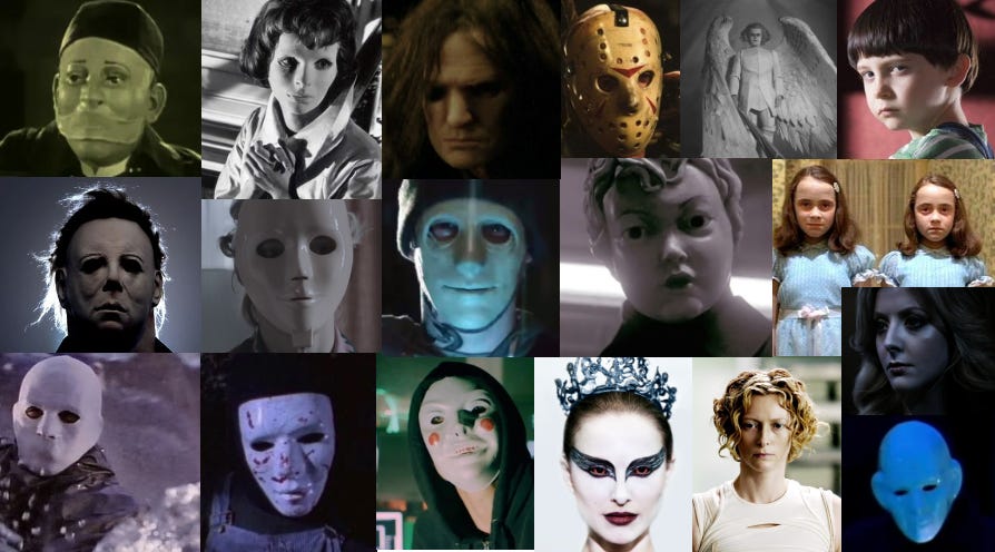 Modern horror inherited the serene face/mask and used it in multiple registers - as a symbol of Roman-style violence against transgression (slashers), as an uncanny facial presentation (psychological horror), and ultimately as a marker of human abstraction and disappearance (sci-fi horror)