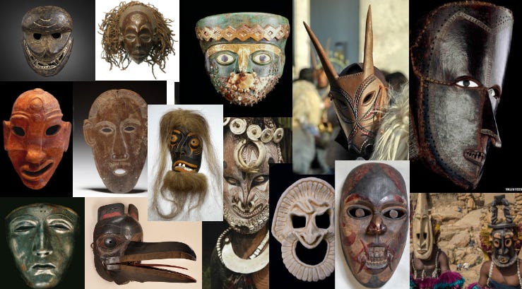 Suffice to say that we know little about the deep origins of masks. Carvings and depictions of human faces are rare (see the Russian Mesolithic Shigir Idol) in the deep archaeological record. Globally masks are used in all sorts of creative ways, and often the mask itself as an object possesses a form of agency, the mask is a being which can impose itself over the wearer. Examples include tutelary spirit masks amongst the Kpelle people of Liberia, Hopi dance masks which are ritually fed to appease them, and Vajrayana Buddhist Cham masks worn in Tibet.