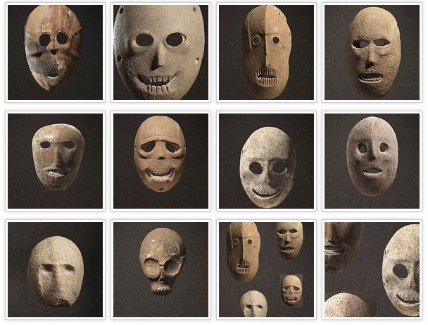 We have almost no evidence of true masks for the aeons leading up to the Neolithic, most likely due to the materials degrading over time. Palaeolithic human-animal figurines, paintings and even Mesolithic antler headdresses have been identified in the archaeological record, but we have to travel to the Neolithic Near East to find any really convincing examples.