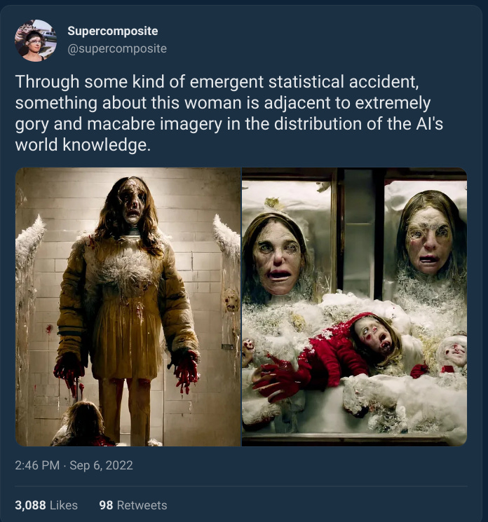 The gears crank on, and AI promises us more in this vein. The tale of Loab as a digital glitch, an intruder into our smooth systems of image generation, prefigures one direction of this technology - AI as portal. What remains to be seen is how the face will respond. AI conjures up faces as hollow masks, devoid of meaning beneath. An empty form with an artificial skinsuit, wearing our likeness but to no end - a void, the mouth opening unto eternity like a Shepard tone scream.