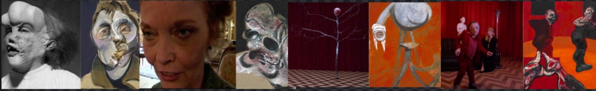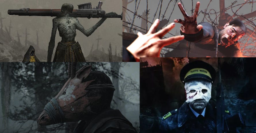 Animal and other forms of monstrous hybridity are so deeply rooted in berserker stories, men wrapped in bear cloaks, tusks on helmets (úlfhéðinn, svínfylkingar, Torslunda, Gutenstein, berserkergang hólmgangumaðr jǫfurr hamask ᚲᚢᛖᛞᚢᛚᚠ!!), it makes sense that so many horror monsters or victims suffer or embrace this chaotic flux - be that a mask (Saw, Creep), an intrusion (Donnie Darko), a transformation (Men). Chaotic unstable forms abound in the works of Francis Bacon, David Lynch and video games like Bloodborne and Dead Space. The face becomes liminal, it loses fixed identity and meaning through diseased corruption, sightlessness, multiplicity of holes, protrusion of teeth, melting of flesh and the grafting of metal. The container of myself, being inside my own skin and flesh, is ruptured traumatically. Both pre-modern and modern images of terror play with this sensation - then scenes of eternal damnation, chewed up by the ravenous gobs of the underworld, now scenes of barbed wire Brusilov barbarity, empty glass eyes breathing through gas. (Trench Tales, Ad Infinitum)