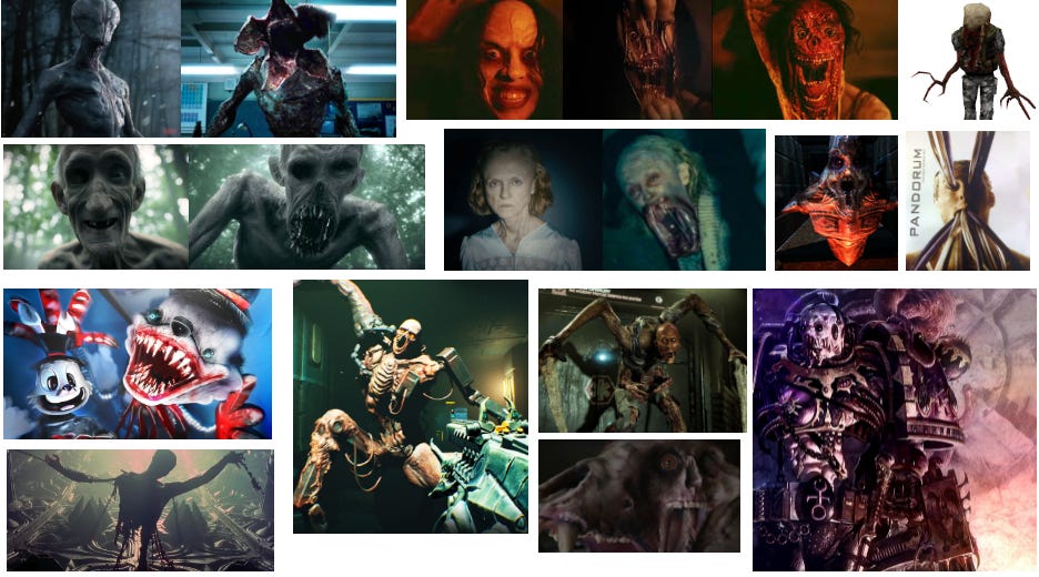 Contemporary horror art has altered the traditional relationship between the face and its beholder. Stability has been replaced with rupture. The face used to present divine beauty, symmetry, or morality, or the grace of god - if outwardly disfigured then a mask would disguise. Modern horror instead uses the face as an unstable mask, out through which a monstrosity emerges. We can call this the ‘eruptive face’. Digital film technology and AI can make this possible in a way previous filmmakers would have found impossible. Faces can be smoothed out, but contain multitudes. Chthonic tentacular feelers, rows of unrolling, unfurling teeth, like a Russian doll, nested in the vast empty interior of the Face «then erupting forth in the confrontational moment». Huggy-Wuggy, the xenomorph, the Demogorgon, Skeleton Man…