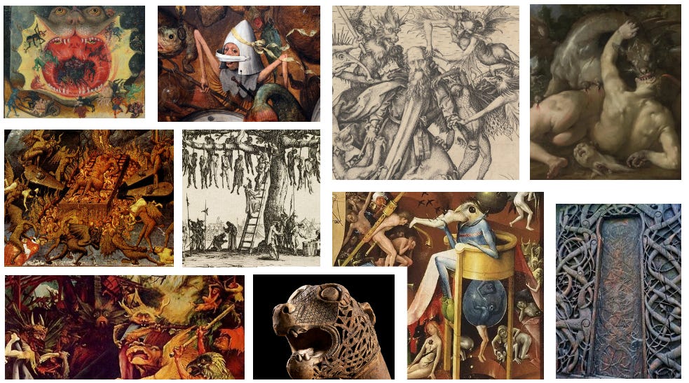 The Garden of Earthly Delights (c. 1500) is a triptych painting by Hieronymus Bosch which never fails to reward another examination. Generations of students have shook their heads wondering how a Renaissance Dutchman could have created such surreal and disturbing scenes - but Bosch was not alone. The ‘northern grotesque’ stretches from the ever-changing vines and dragons of Norse wood-carving well into the Renaissance period, with its peak being reached between AD 1400-1600. Artists include the Limbourg Brothers, Martin Schongauer, Albrecht Dürer, Matthias Grünewald, Pieter Bruegel the Elder, Hans Baldung Grien and Cornelis van Haarlem - to name a few. Many of their paintings require patient, close-up observation to see just how detailed and horrifying they really are - for here is truly a realm of surreal, nightmarish images. Snarling, laughing demons swirl around monstrous human-animal hybrids. The grotesque explodes into the world, gaping maws open wide, human war and death and pain are distorted by the presence of this other, chaotic world. There is no harmony, only monstrosity.