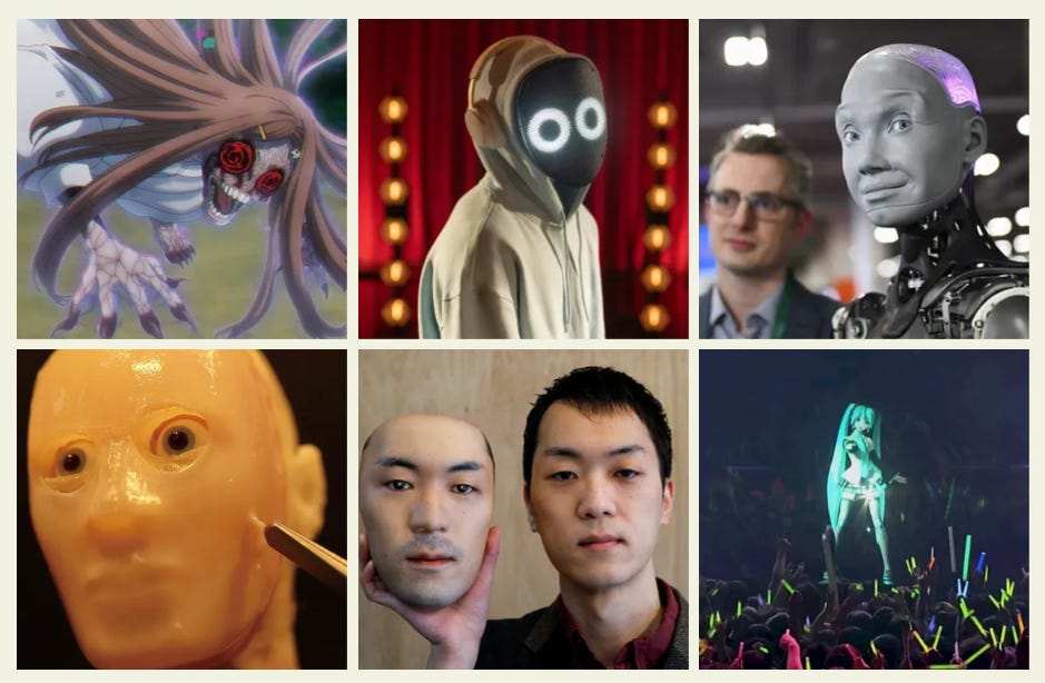 In Western horror, the loss of interiority is usually catastrophic because the face is still expected to testify to ensoulment and authentic feeling. J-horror comes out of and builds on a tradition where an empty form can survive: the face remains correct, the body continues its normal routine but the animating core is thinned-out or absent. In a kind of techno-animist sense, what links the cursed school corridor and wet-haired onryō to modern avatars and synthetic personas is a relay of personhood. Japanese visual culture has long normalised performative and non-naturalistic faces as emotionally operational rather than morally deficient. Anime, masks, dolls, mascots, cosplay, kawaii-core, VTubers and so on all help produce a cultural environment in which the face does not need to be a transparent window into the soul in order to function socially and affectively. A synthetic or artificially generated face is a surface engineered for attachment. They do not need depth in the old Western sense. They need only enough responsiveness and stylisation, some procedural intimacy to hold attention and they inevitably invite projection.