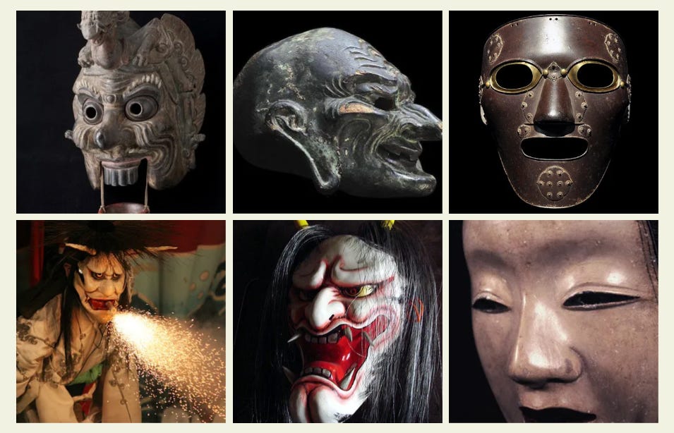 Japanese and Western horror both make use masks, but they do not use them in the same way. Examples from across Japanese tradition such as early gigaku (an outdoor Buddhist masked procession-performance introduced from Baekje, flourishing in the 7th/8th centuries), later stage arts such as Noh and Kyōgen and Shinto kagura dances all repeatedly show masks as a technology of transformation. This logic is grounded in an ontology of surfaces-as-interfaces, which is neither the serene mirror of Apollo nor the numinous rupture of the Germanic north. There is also no primary anxiety over deception, falsehood, trickery or deceit - hence why Japanese horror masks tend to feel less like a lie and more like a threshold through which contamination, mediation or uncanny agency enters the visible world.